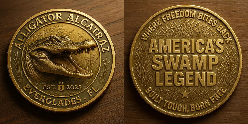 Complementing the hat is the Alligator Alcatraz commemorative coin, forged in antique gold with exceptional detailing.
